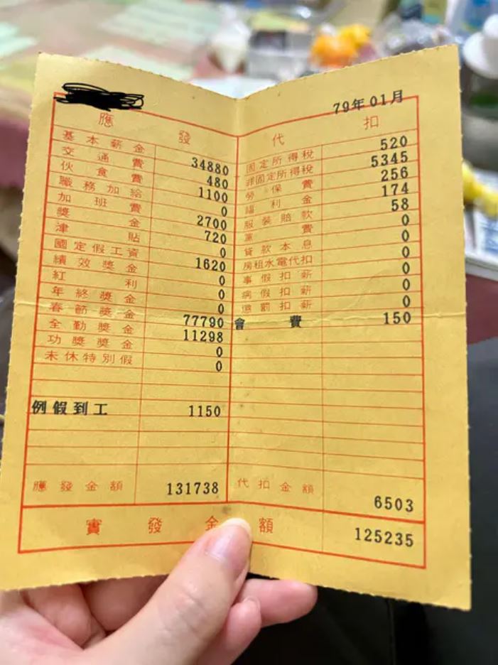 ▼這張薪資條是1月的,當時即將迎來農曆春節,所以公司還發放了7萬7790元的春節獎金。零零總總加起來,再扣除所得稅、勞保費等等,原po的阿公在民國79年1月領到了12萬5千元。原po補充說,阿公是在「機場機坪組」工作。