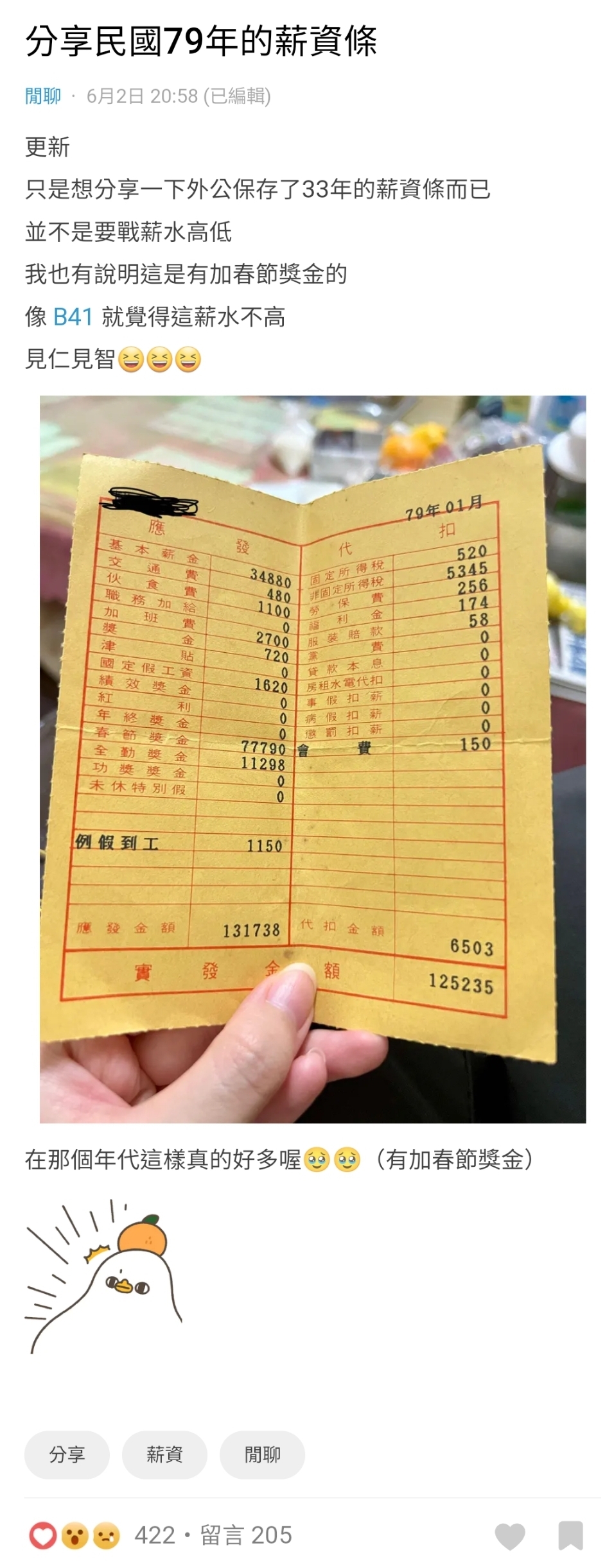 這張薪資單曝光後引發熱議,網友們留言說:「我爸都說我們這代很辛苦,他20歲出社會一個月就三萬了,到現在還是三萬,但所有物價都是翻倍以上」、「看到這33年前的全勤獎金跟春節獎金,再想到我的年終4月才拿到,還只有1725,真的想哭」、「現在全勤有1000就該偷笑」、「阿公全勤領1萬1…如果是我大概會忘記請假兩個字怎麼寫」、「那時候賺3萬4,等於現在賺7-8萬吧」。