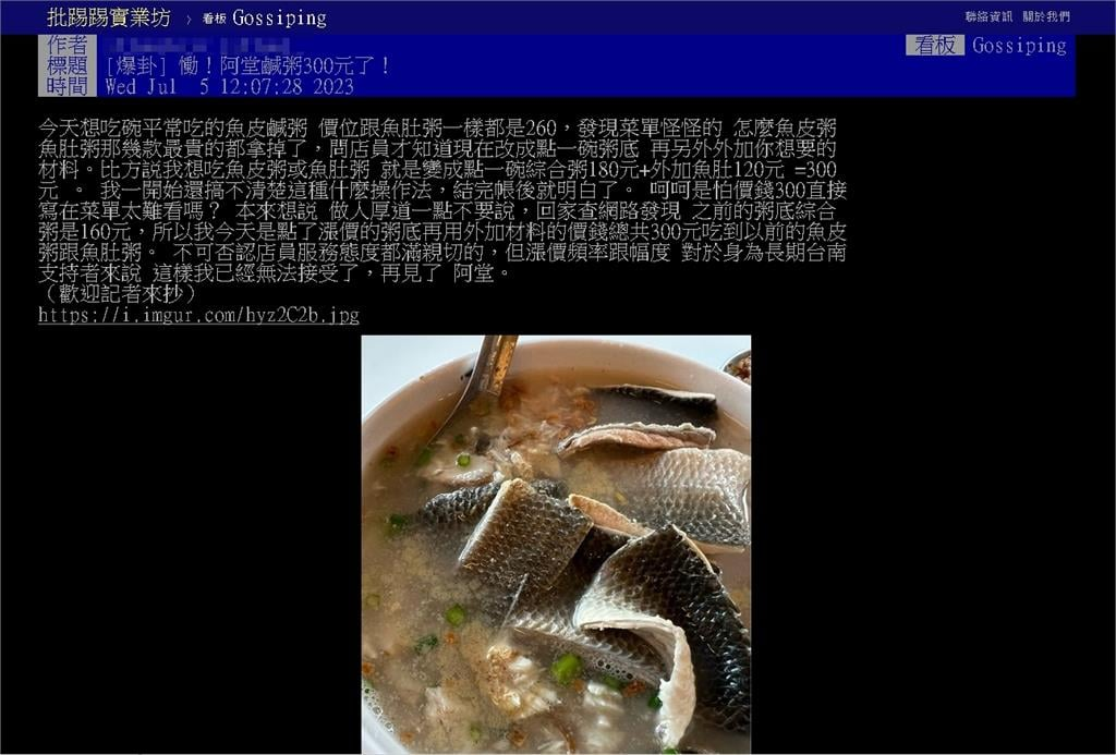 原po在PTT以「慟!阿堂鹹粥300元了!」為題發文說,今天突然想吃碗平常吃的魚皮鹹粥,價位跟魚肚粥一樣都是260元。他到阿堂鹹粥點餐時發現菜單怪怪的,幾款最貴的商品都拿掉了,一問店員才知道,現在改成點一碗粥底,再另外加想要的料。