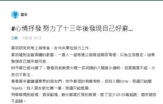 原po在Dcard發文說,他當年受到金融海嘯的影響,研究所考上高考後,原以為會過上穩定的生活,但在單位任職13年後卻發現自己越來越可悲。他年薪100萬出頭,仍然買不起房,孩子也不敢生。原po表示,當年選擇在一般公司的朋友們,有的成為經理,有的成為資深副理,薪資都比他高,差了20、30萬起跳,他只能開Toyota、租房住,感覺越來越抬不起頭。