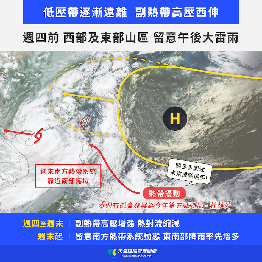 天氣風險公司分析,週末可能再度變天,另一個熱帶擾動所處環境將有利其發展增強,因此快的話將有機會在19日至21日(週五)期間增強為杜蘇芮颱風,而且依未來大氣環境配置來看,副熱帶高壓雖有西伸但位置偏北,將使得南方熱帶系統往北靠近。因此多數預測結果顯示,該熱帶系統週末有很高機會往呂宋島北部到巴士海峽南部通過進入南海,期間尚不排除發布颱風警報,東南部也有機會受到颱風外圍環流影響,降雨有增多的趨勢。