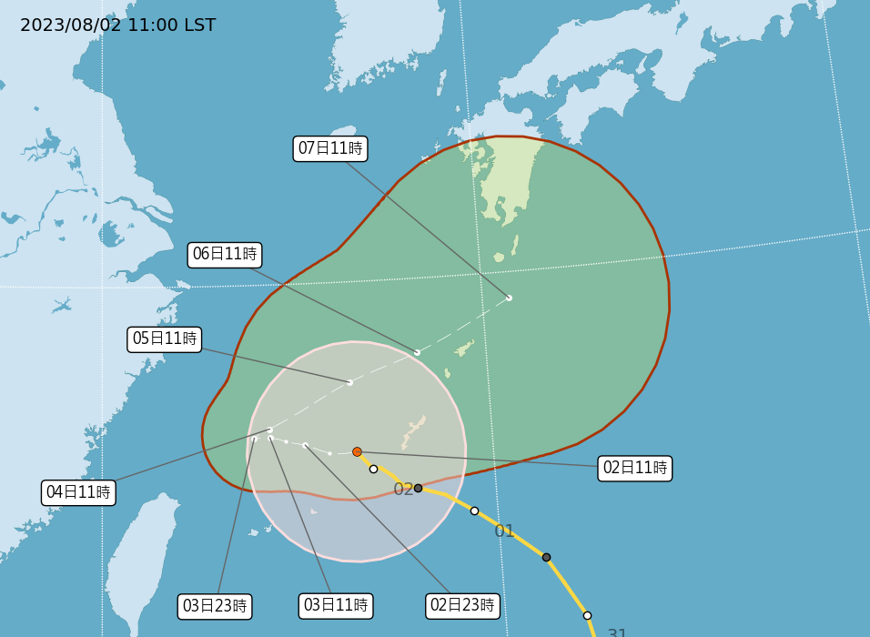 2023年08月02日中颱「卡努」目前持續朝西北方向台灣靠近,中央氣象局1日發布海警,預計今天(2日)晚間發布陸上颱風警報。中央災變中心1日舉行第一次工作會報,氣象局指出,卡努逐漸增強,不排除有成為強颱的可能性,且北部、東北部地區首當其衝,預計週四、週五(3、4日)颱風最接近台灣。天氣風險公司表示,依預估風力資料,研判新北市週四可達停班課標準。