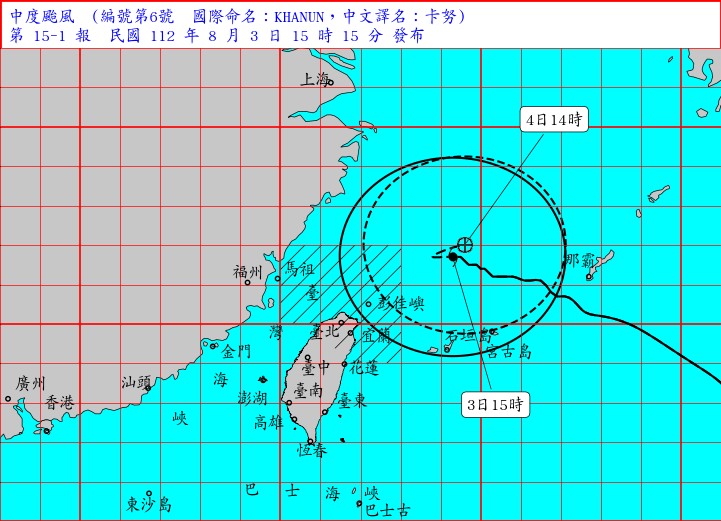 2023年08月03日卡努颱風持續逼近!根據中央氣象局最新消息,中度颱風卡努今天(3日)下午3時的中心位置在北緯26.7度,東經124.3度,即在台北的東北方約330公里之海面上,以每小時5轉7公里速度,向西轉東北東進行。其暴風圈已進入台灣北部近海及東北部近海,對新北、台北、基隆及宜蘭將構成威脅。