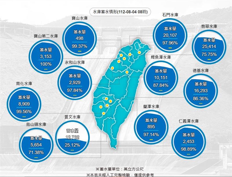 ▼南部水庫進帳最少,共收下450萬噸。聯合運用的曾文及烏山頭水庫進帳340萬噸,蓄水率分別上升至23.1%及71.4%,蓄水量合計1億7341萬噸,牡丹水庫73%,南化、蘭潭及仁義潭水庫接近滿庫。
