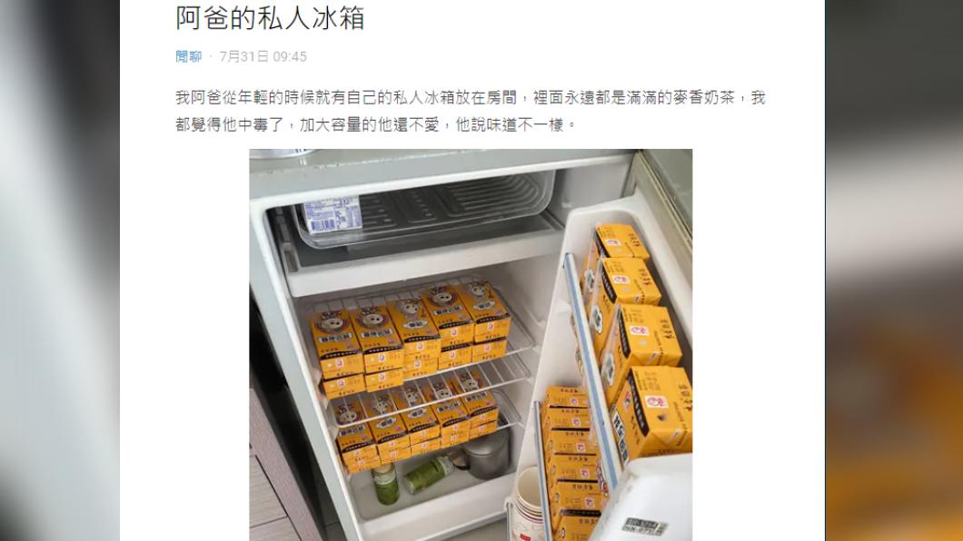 ▼原po在Dcard上發文說,爸爸年輕時就在房間裡裝了一台私人冰箱,「裡面永遠都是滿滿的麥香奶茶」。她開玩笑說爸爸中毒了,而且爸爸不愛加大容量的麥香,只愛10元版本,因為味道不一樣。