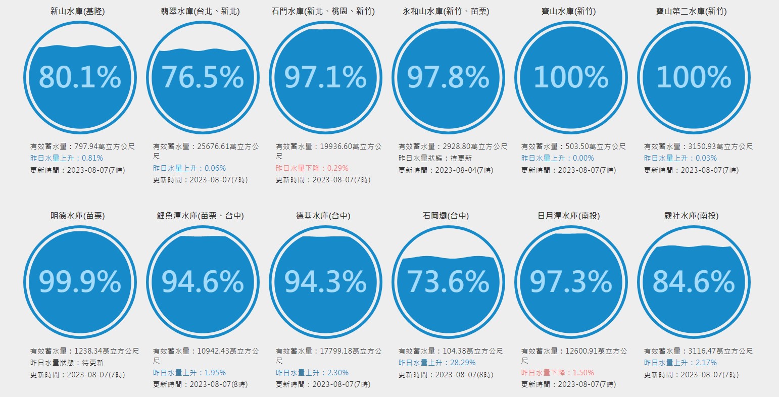 ▼由於西南風帶來水氣,北部水庫除翡翠水庫蓄水率達76.6%最低外,其餘水庫水量都超過8成以上,寶二水庫滿庫,石門、永和山、明德等水庫也都接近滿庫。中區水庫蓄水率最低為霧社水庫,達84.6%,其餘水庫也都滿庫。