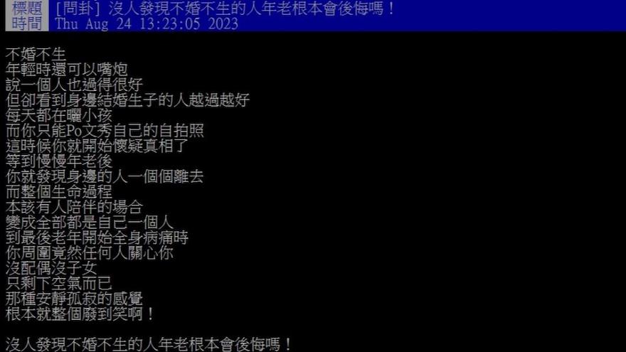 原po在PTT以「沒人發現不婚不生的人年老根本會後悔嗎」為題發文說,年輕時還可以說「一個人也過得很好」,但看到身邊結婚生子的人越過越好,每天都在曬小孩,而自己只能po文秀自己的自拍照,這時候就開始懷疑真相了;等到慢慢年老後,就發現身邊的人一個個離去。