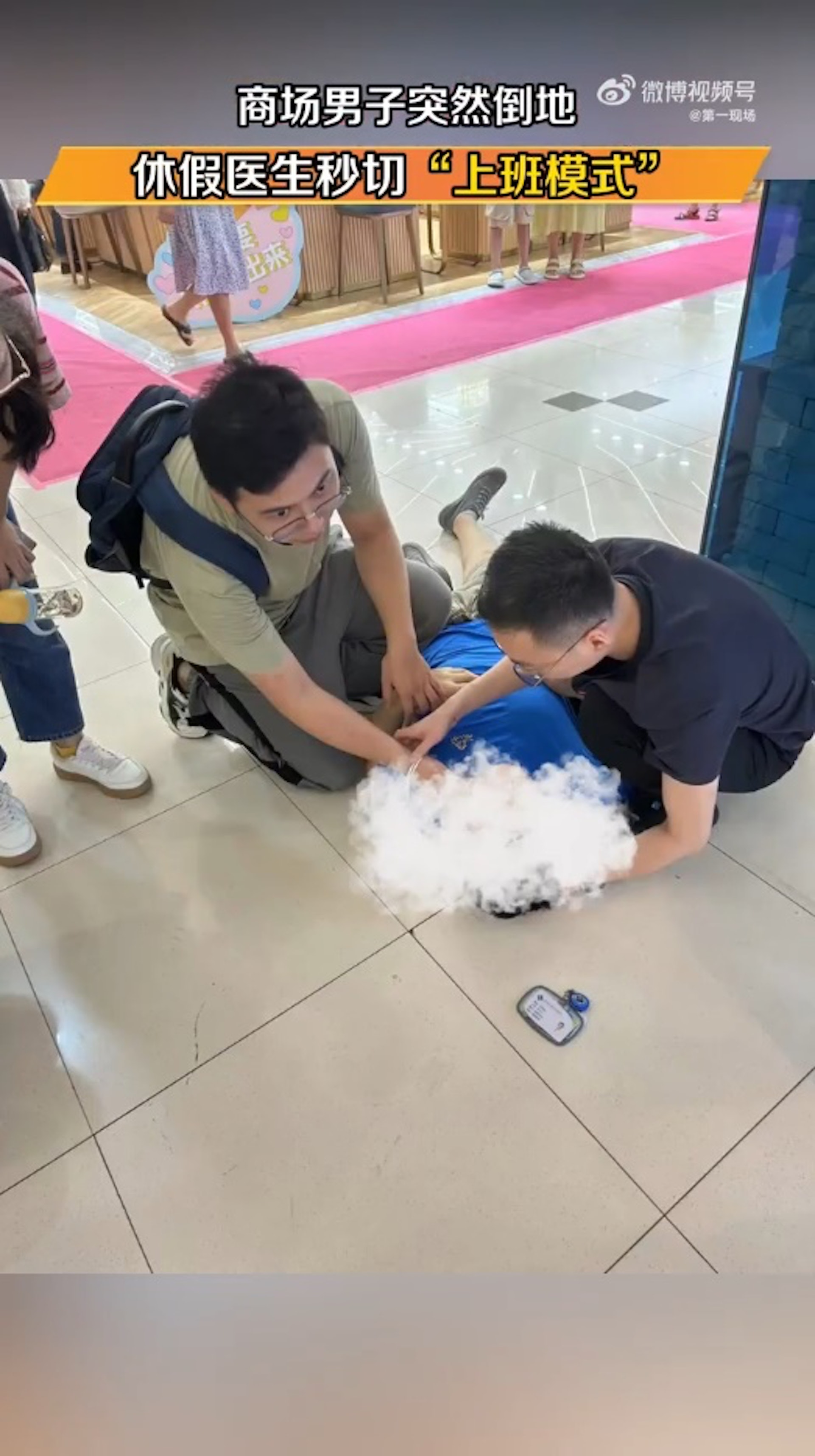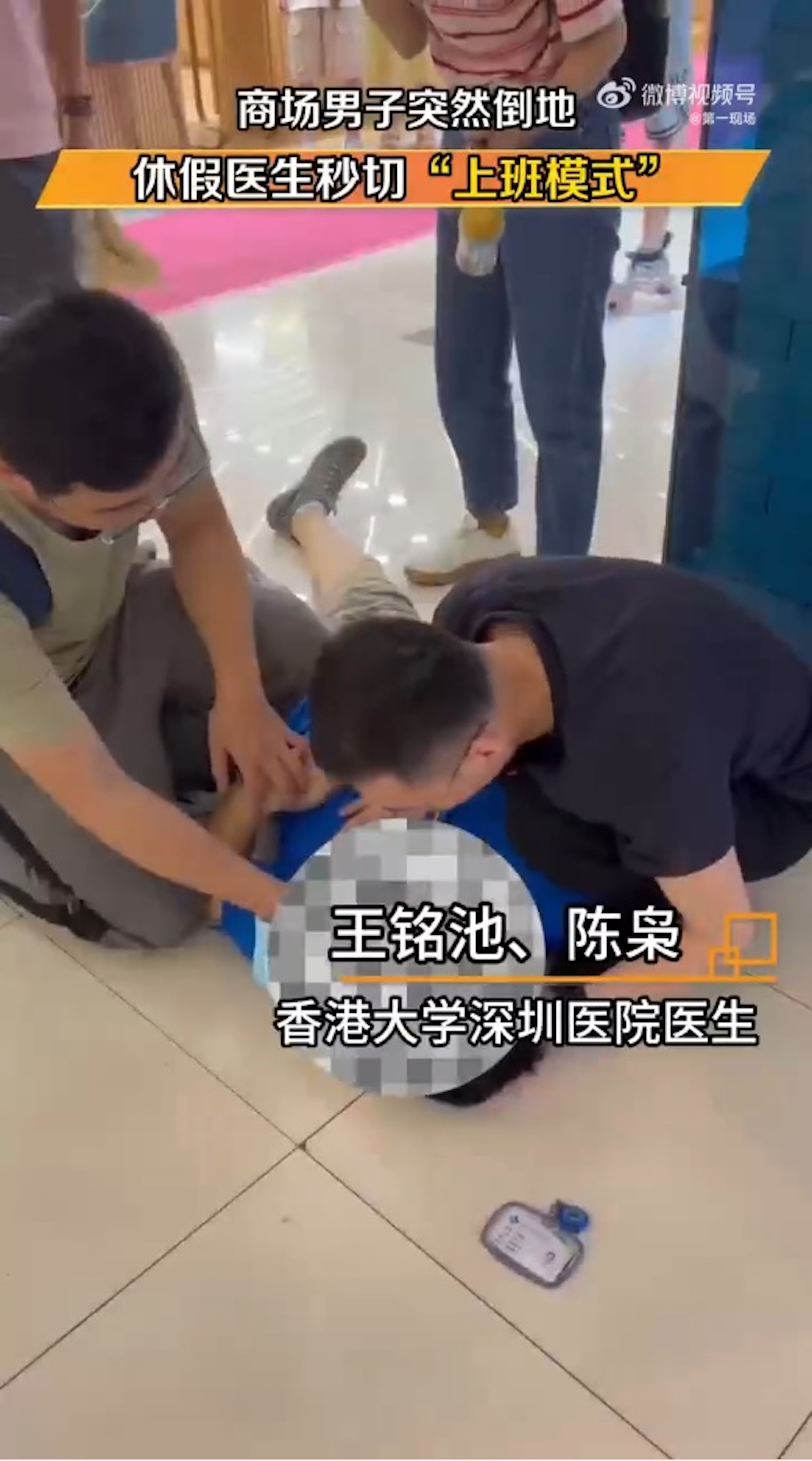 2023年09月06日日前中國大陸深圳一名50多歲的男子獨自逛商場時突然倒地昏迷,路人們發現後立刻伸出援手,並大喊「有人暈倒啦」!聽見呼救聲,正在休假的香港大學深圳醫院外科醫生王銘池和陳梟立即上前搶救,因為他們在黃金時間內進行施救,才將男子從死神手中救回來。