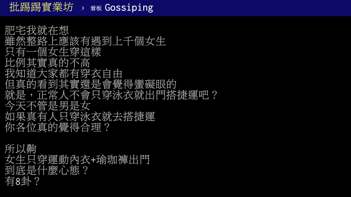 原po在PTT發文說,他在上班通勤時看到一名女生穿著運動內衣和瑜伽褲在等捷運,這讓他覺得很奇怪。他表示自己一路遇到上千個女生,只看見這一個女生這樣穿,比例其實真的不高,而且他能夠理解大家都有穿衣自由,「但真的看到其實還是會覺得蠻礙眼的」。