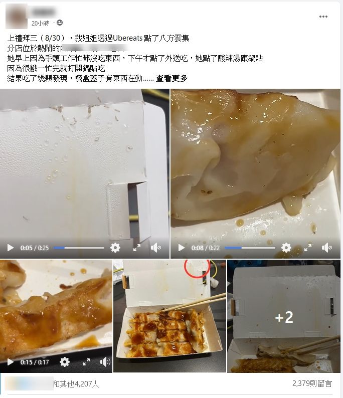 原po在臉書社團「爆料公社」發文說,姊姊在8月30日透過外送平台點了八方雲集的鍋貼,但打開吃了幾顆後,竟發現餐盒蓋子上有數條小蟲蠕動,疑似是蛆。原po立即請姊姊把食物包起來並錄影,還在下班後帶著姊姊前往診所看診。