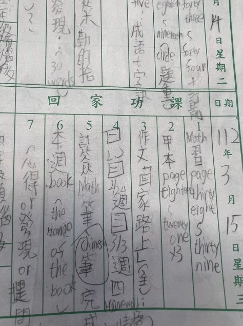 原po在PTT發文說:「身為國小生跟國中生的家長告訴你,台灣在基礎教育的雙語政策,最後就是創造出國語不行、英語不行,甚至數學等學科也不行的新一代。」他po出孩子的聯絡簿照片,只見記事欄中句句中英夾雜,包括「整理錯題note」、「chinese講義 seventy six到seventy seven」等等。