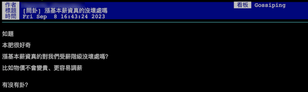 對此,網友們紛紛留言說:「漲基本工資是好事,但通膨沒壓就ㄏㄏ」、「只對領基本薪資的有好處」、「領高於基本工資的族群可能反而有壞處」、「看似漲薪水,實質卻縮水」、「目前就是薪水加1元物價漲10元的感覺」、「漲薪資對上班族根本沒差,你各位誰領基本工資?」。