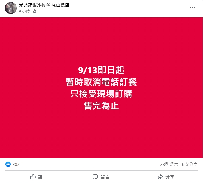 2023年09月11日近期麥當勞推出的螯龍蝦堡熱賣,高雄鳳山一間賣「龍蝦沙拉堡」的小攤販也跟著走紅,引發大批民眾搶購。沒想到有人竟因買不到怒刷負評,讓老闆很無奈。老闆在臉書發文道歉,並宣布13日起只接受現場訂購,暫時取消電話訂餐。