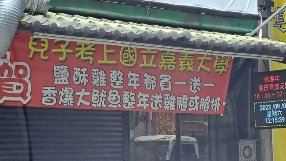 2023年09月12日9月開學季到來,各地的高中畢業生們紛紛踏入大學校園,迎向新的生活挑戰。日前一名網友發現,桃園市的一間雞排店掛出紅布條,上面寫著「鹽酥雞整年買一送一」。對此,該店的老闆娘透露,她是因為兒子考上嘉義大學,替他感到高興,才會推出這一活動與大家分享喜悅~
