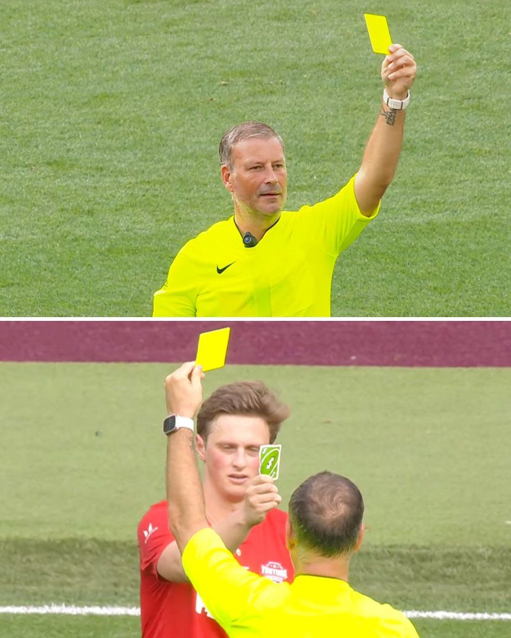 ▼比賽進行到第78分鐘時,YouTuber福什(Max Fosh)因為一次犯規行為,被前英超裁判馬克(Mark Clattenburg)亮出一張黃牌警告。但頑皮的福什沒有乖乖吃下黃牌,他等馬克高舉黃牌跑到他面前後,竟一臉嚴肅地從口袋中掏出一張知名卡牌遊戲Uno的「綠色反轉卡」。