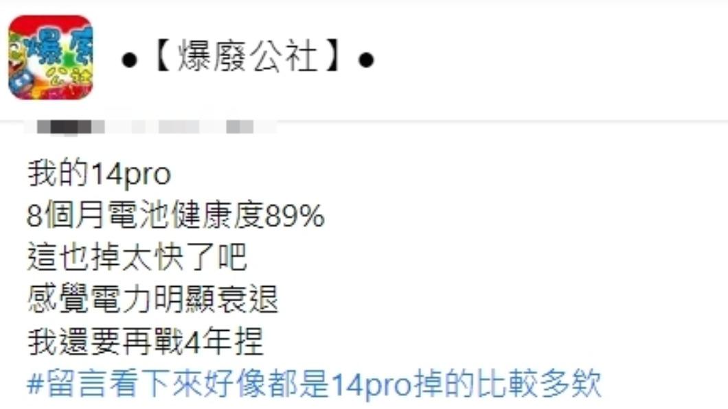 ▼原po在臉書社團「爆廢公社」中發文說,他的iPhone 14 Pro僅使用8個月,電池健康度已經下降到89%,他直言「這也掉太快了吧」,並憂心說「感覺電力明顯衰退,我還要再戰4年捏」。
