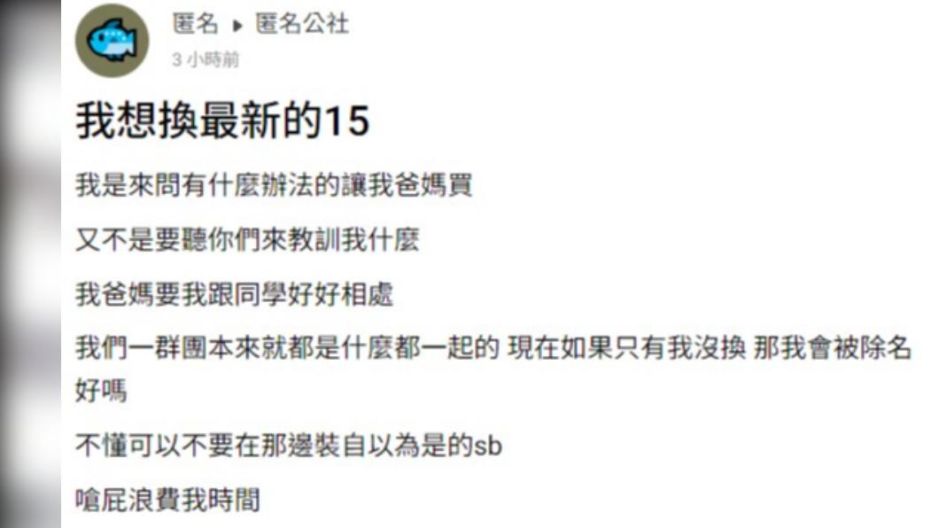 原po在臉書社團「匿名公社」發文問:「有什麼辦法可以叫我爸媽買最新的15?」他表示自己目前仍是國中生,不能打工賺錢,因此只能仰賴父母之力。他也強調,如果自己有工作能力,絕對會自行購買新手機,而不是向爸媽伸手。