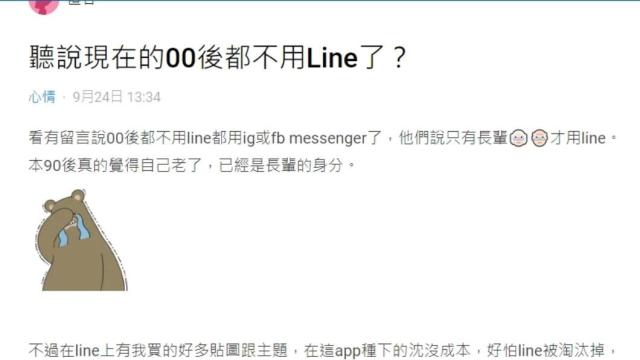 也有網友認為:「2005年生,討厭LINE,對話紀錄不好轉,還會過期」、「為了躲家長啊,還會傳很多假訊息」、「LINE就是難用啊,光是文件會過期就很煩」、「我不是00後我也會用,因為LINE真的太容易洗版」、「因為不用工作啊,不然誰想要私生活被當八卦傳,我LINE也只拿來公務聯繫,不用透露太多個人訊息蠻方便的」、「LINE基本上只有工作上在用,私下也不會去用LINE」。