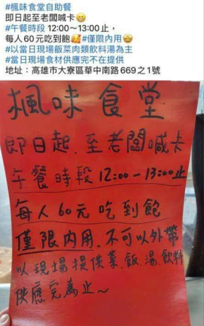 ▼為了增加曝光度和吸引更多民眾,店家也在大寮區的臉書社團中進行宣傳說:「即日起至老闆喊卡,午餐時段12點到下午1點,每人60元吃到飽,僅限內用。以當日現場飯、菜、肉類、飲料、湯為主,當日現場食材供應完不再提供」。