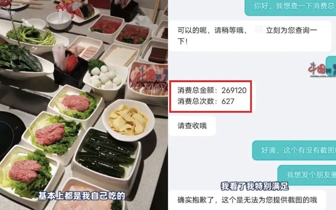 ▼這名女子透露,她對海底撈的火鍋情有獨鍾,幾乎每週都會去那裡用餐,甚至曾在一週內連續12次光顧海底撈。除早餐外,她的午餐和晚餐都在這家火鍋店享用。她強調,這近27萬元的消費幾乎都是她個人的開銷。因為太喜歡海底撈,她平時還會將公司或家庭聚餐都安排在這裡。