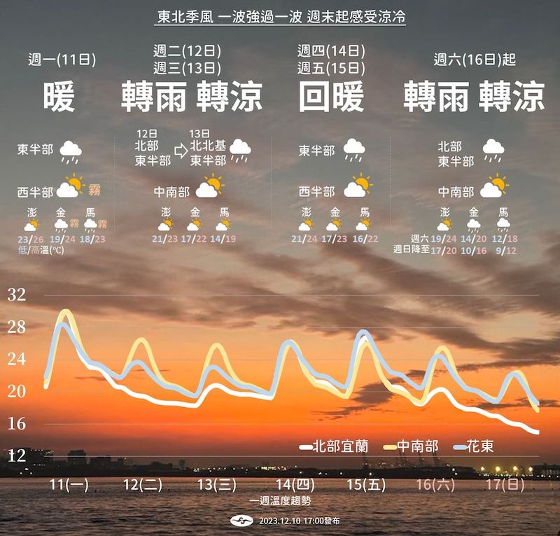 2023年12月11日氣象專家吳德榮表示,台灣即將面臨顯著的氣候變化。今日(11日)一早,台灣各地雲層稀疏,尤其在東部地區,海上低雲密集,伴隨著降雨現象,花蓮與台東地區出現局部降雨情況。今晨最低氣溫在新竹(關西鎮)錄得18.3度,而其他地區的平地最低氣溫也在19至20度之間。