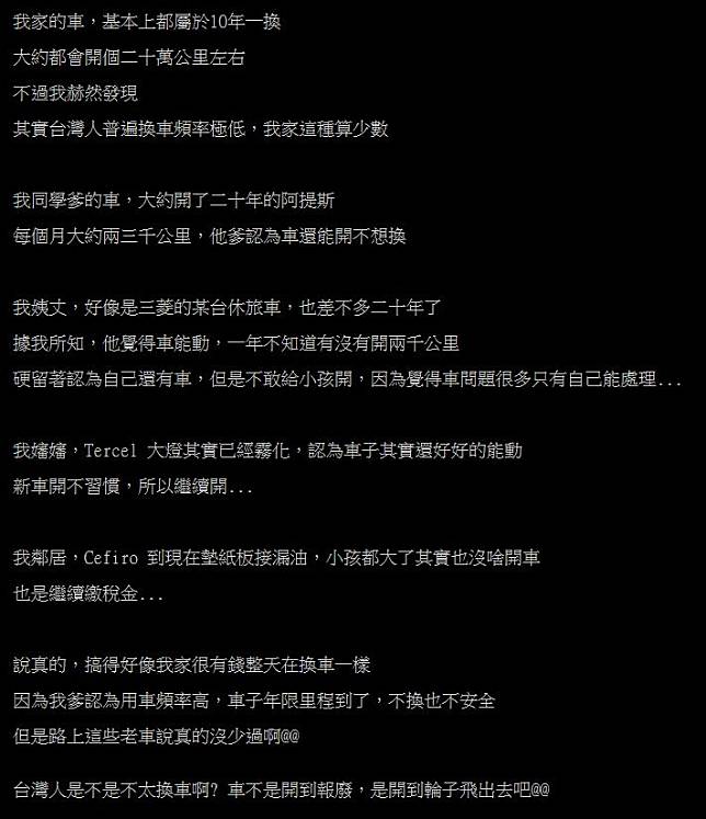 原po在PTT上發文說,他家的車子大概10年一換,大約開20萬公里,但他觀察發現,「其實台灣人普遍換車頻率極低,我家這種算少數」。原po分享了身邊的例子,同學爸爸的車已經開了20年,每個月行駛2000到3000公里,但仍認為車子能開就不想換;姨丈的休旅車也開了20年了,即便車子經常出問題、不敢給孩子開,也不願意換;還有嬸嬸的車子大燈已經霧化,但因為怕新車開不習慣,而繼續開舊車。
