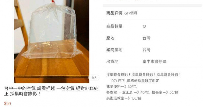 購物平台上,這些空氣袋標題寫著「台中一中空氣,100%純正」,並強調採集時會錄影。價格根據空氣取得難度而定,隨手撈的空氣30元,各處室及游泳池的空氣40元,校長室的空氣50元,而最貴的美術班教室空氣則售價100元。