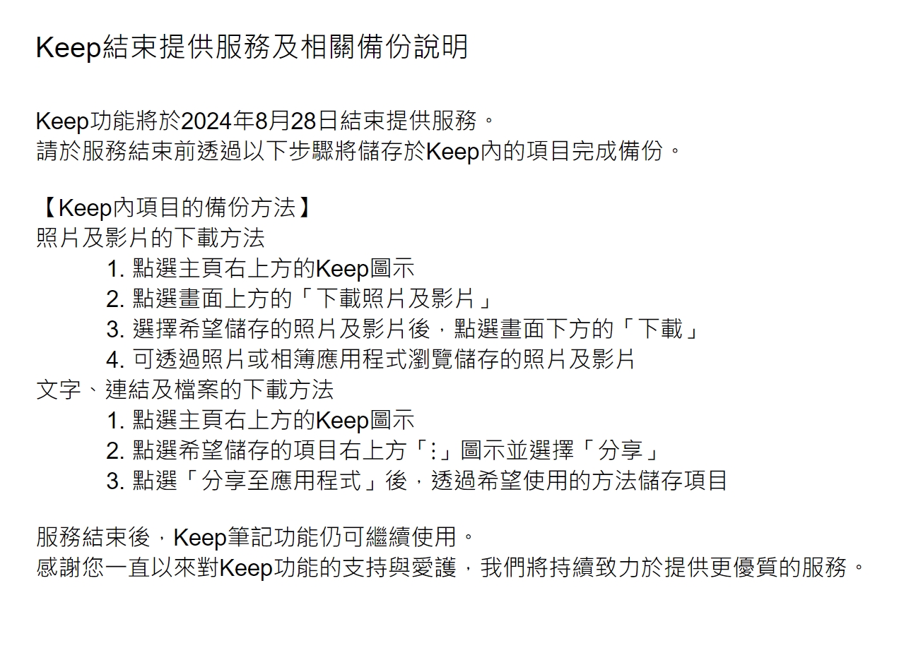 針對「Keep」服務的終止,LINE台灣官網提醒用戶,務必在8月28日(星期三)13:00前完成資料備份。以下是具體的資料儲存方法: