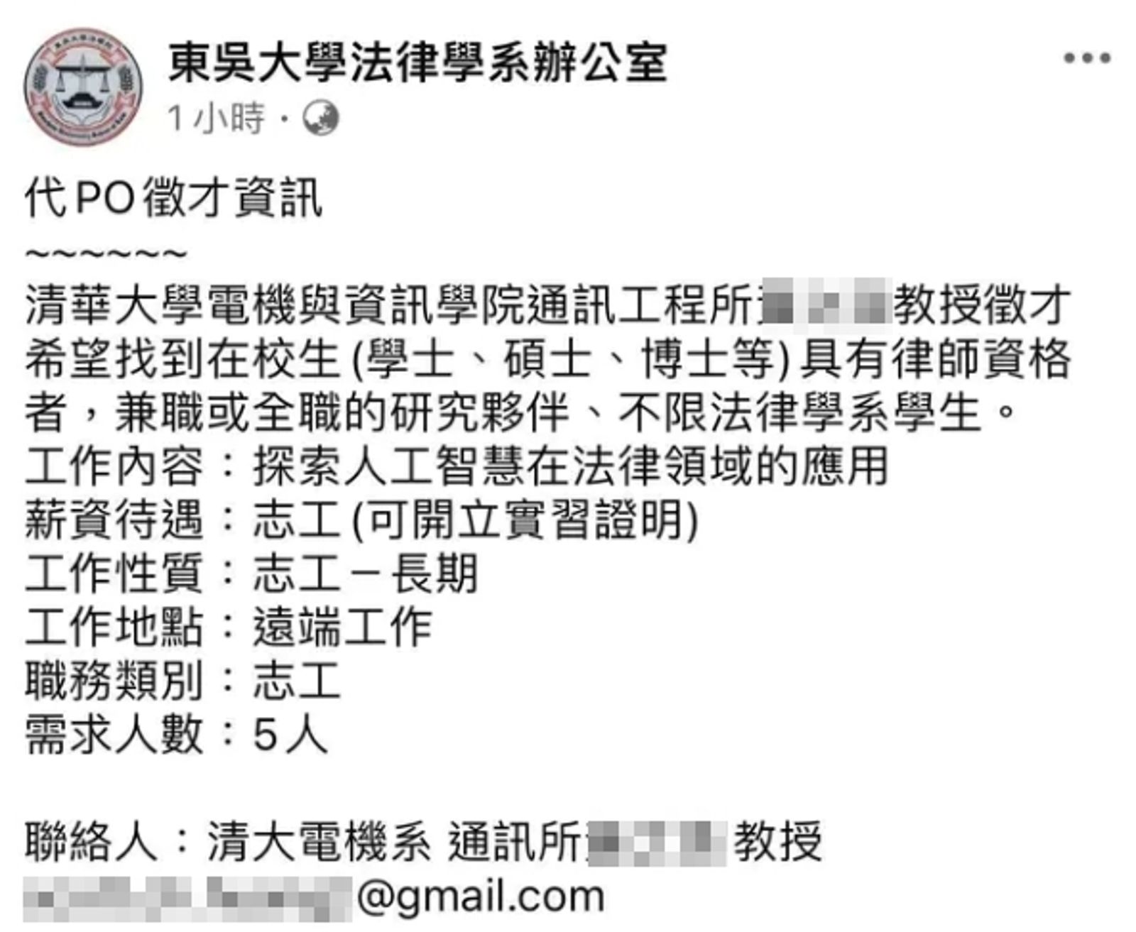 ▼該徵才信息由東吳大學法律學系辦公室在臉書粉專代發,內容顯示,清大電機系通訊所教授希望找到具有律師資格的研究夥伴,工作性質為遠端工作並可開立實習證明,但不支薪且需求人數多達五人。目前,東吳大學法律學系辦公室已刪除該徵才信息。