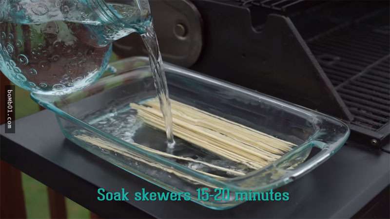 ▼將竹籤浸泡15~20分鐘,一次用兩根穿烤肉和蔬菜,這才就不會滑落下來。
