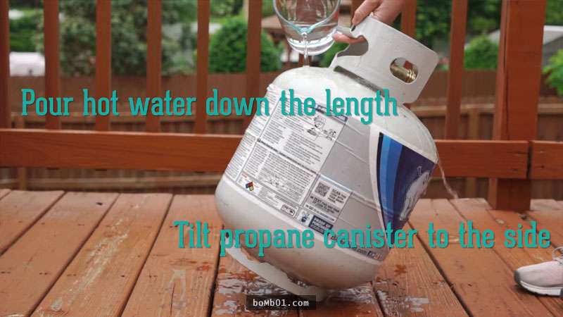 ▼不知道罐子中還剩多少丙烷,就沿著一側倒些熱水。罐中還有丙烷的那部分會吸收熱水的溫度,罐子的觸感會涼一些。你只需要從底部開始,逐漸感受丙烷罐子上那條虛擬的冷熱交界線,就能測出剩餘的丙烷量。