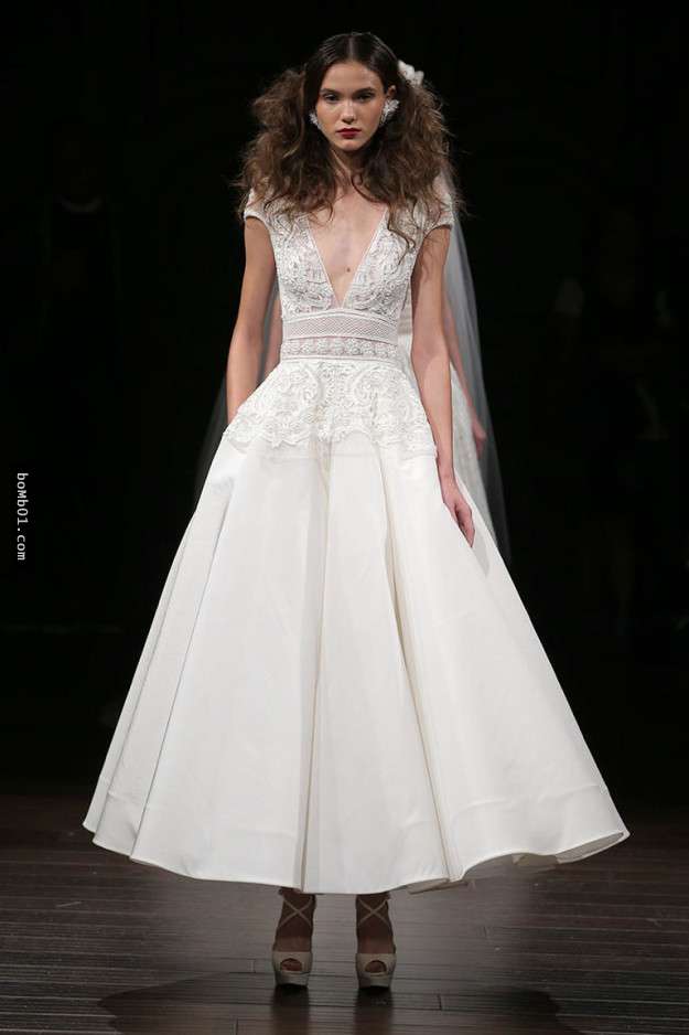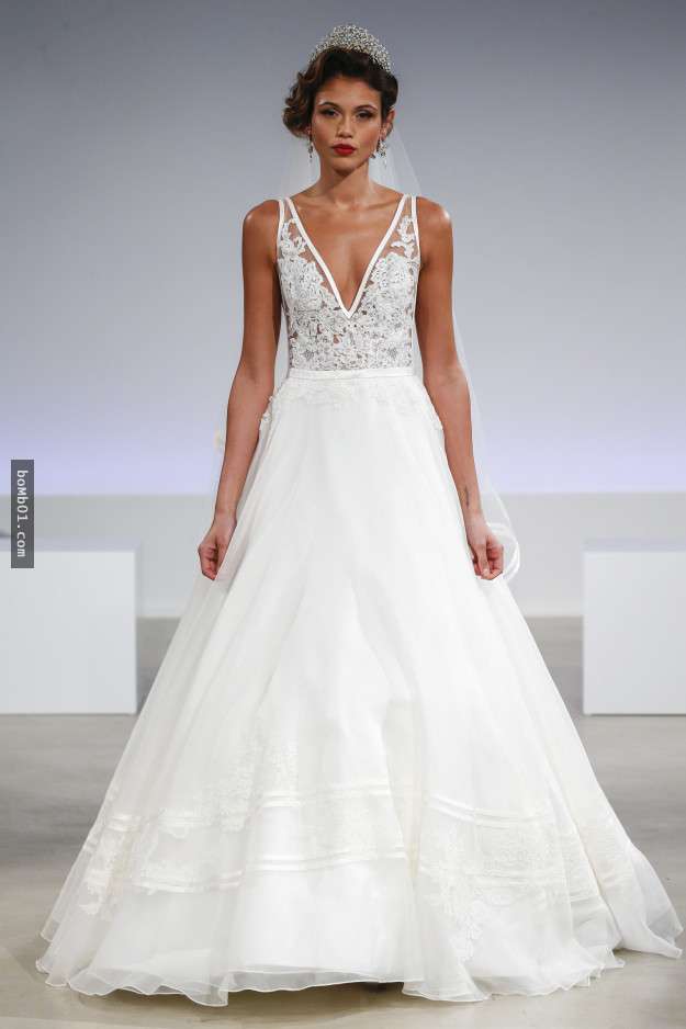 ▼Inbal Dror是以色列的著名品牌,這款深V的婚紗可以充分體現新娘的完美身材,腰間蝴蝶結的設計也是女生的最愛。