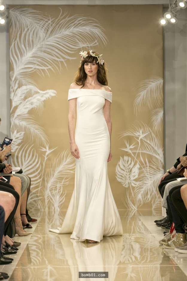 ▼一字肩的婚紗可以很好的凸顯新娘的鎖骨,裙尾的設計也使得身材更加修長纖細。