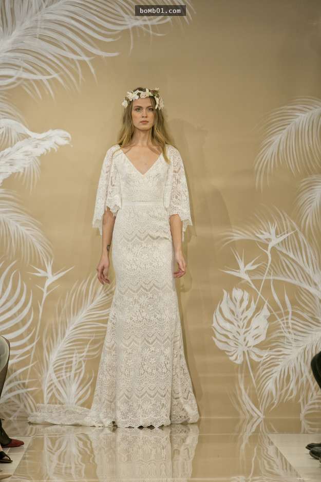 ▼來自義大利的品牌Ines Di Santo設計出半透式的上身,鏤空的的雕花讓新娘宛若花叢中走出的仙子。