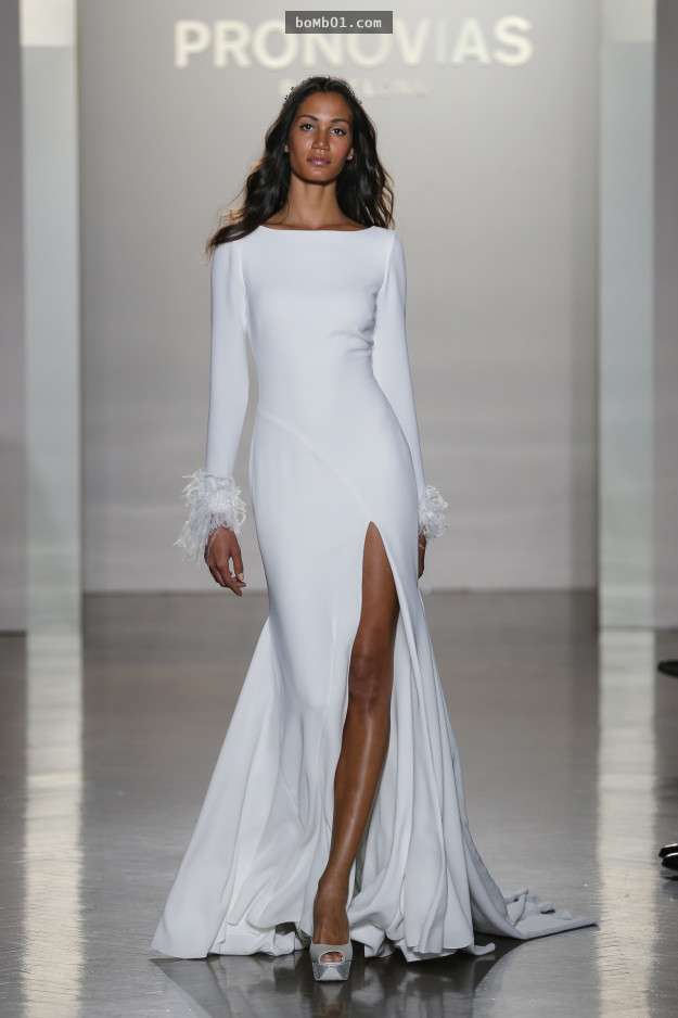▼這件長袖的婚紗整體都具有刺繡雕花的設計,就像一片片散落在婚紗上的花朵,收腰的設計更是展現完美身材的絕佳創作。