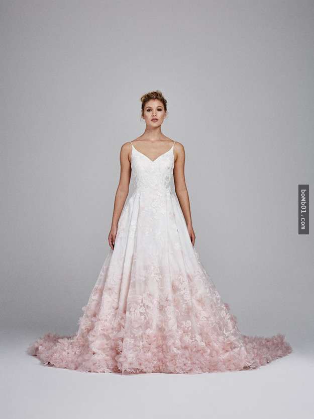 ▼Kelly Faetanini推出的這款婚紗滿足了無數少女的粉嫩心,淺粉色的花朵更是鋪滿了腳下的路,每一步都想走在花叢中。
