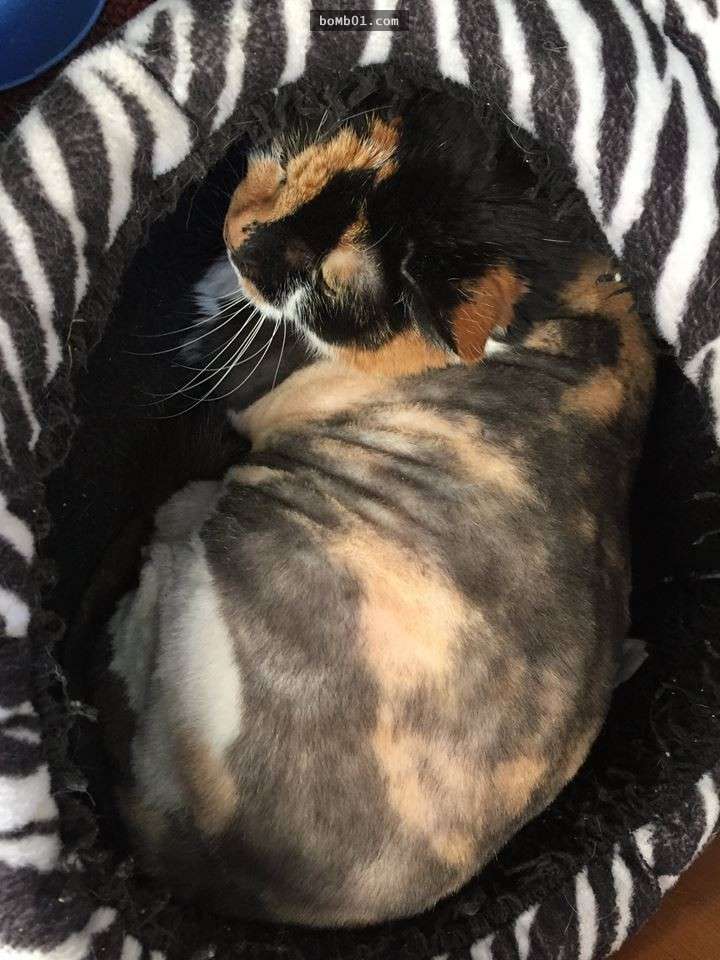 ▼幸好,現在已有一名飼主的遠親現身表示願意領養 Hidey,這隻長年被忽略的三花貓原本極為缺乏自信,常常躲在床底下,但現在的牠舒服的躺在專屬自己的床上,還常常發出呼嚕聲呢!
