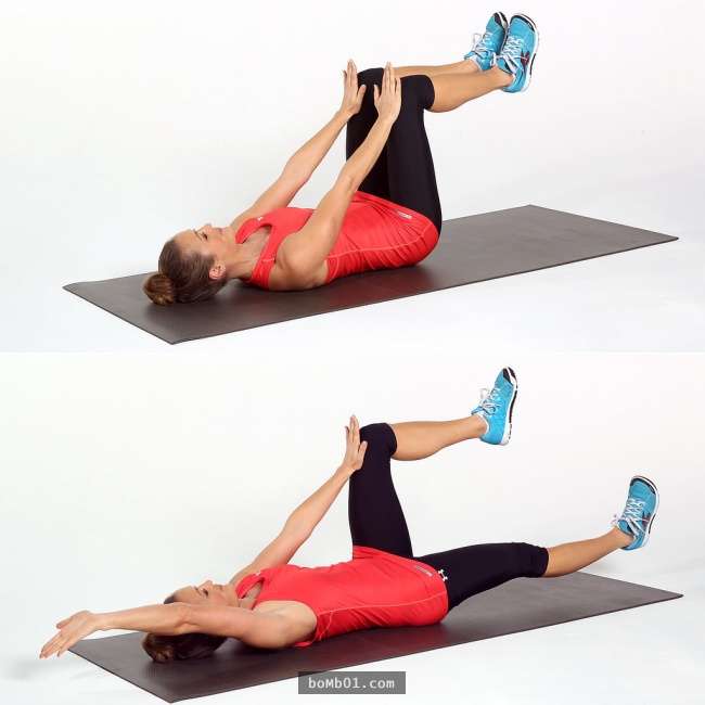 面朝上躺好,接下來將手伸出來,腳也舉起來,然後重複做著用右手碰右腳膝蓋、左手碰左腳膝蓋的動作就可以了。