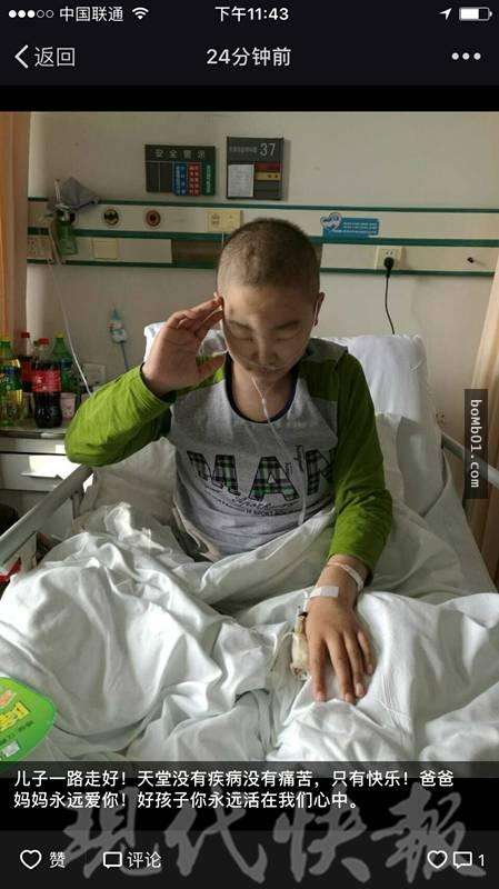 2017年01月05日15歲的丁雁超是個很可愛的孩子。他出生在大陸揚州市江都區一個普通的農民家庭,從小就聰明懂事,年僅7歲就能一個人騎車上學,每次考試都名列前茅。因為父母很忙,他主動承擔起了照顧妹妹的責任,還會在父母下班前做好飯,等他們回來吃。誰也沒有想到,這樣一個好孩子會罹患可怕的癌症。