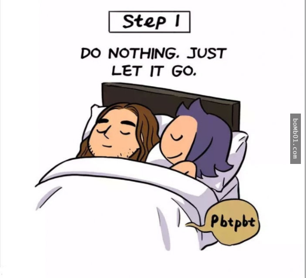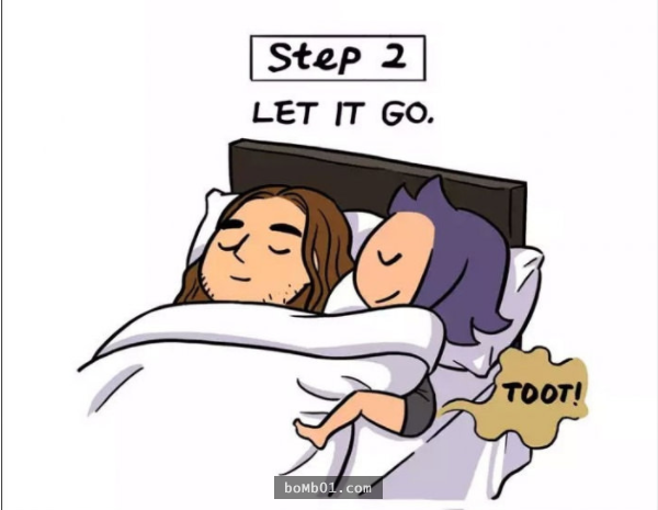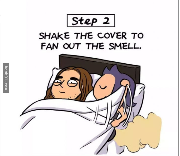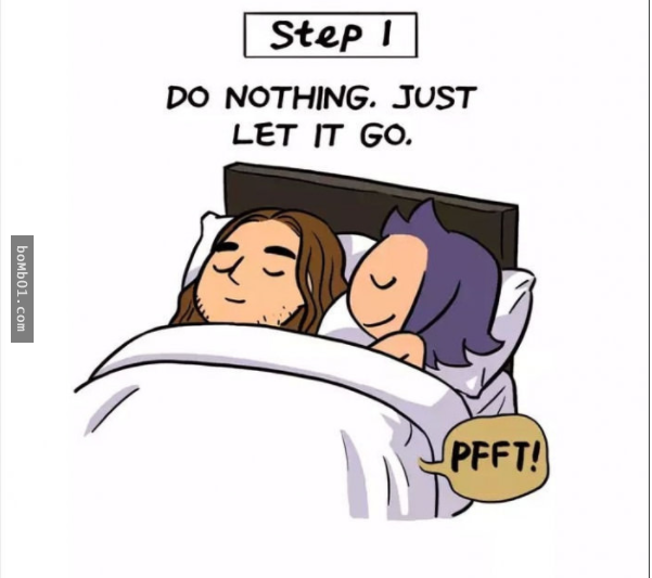 ▼1.正確方式。第一步:輕輕下床;第二步:離開臥室,關上門;第三步:盡情放屁;第四步:散散味道;第五步:輕輕回床上繼續睡。