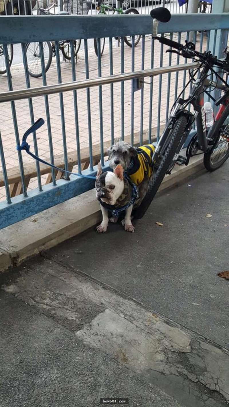 ▼熱心民眾發現,這樣寒冷的天氣兩隻狗狗被栓在天橋上。法鬥已經開始流鼻涕了,這樣下去會生病的。