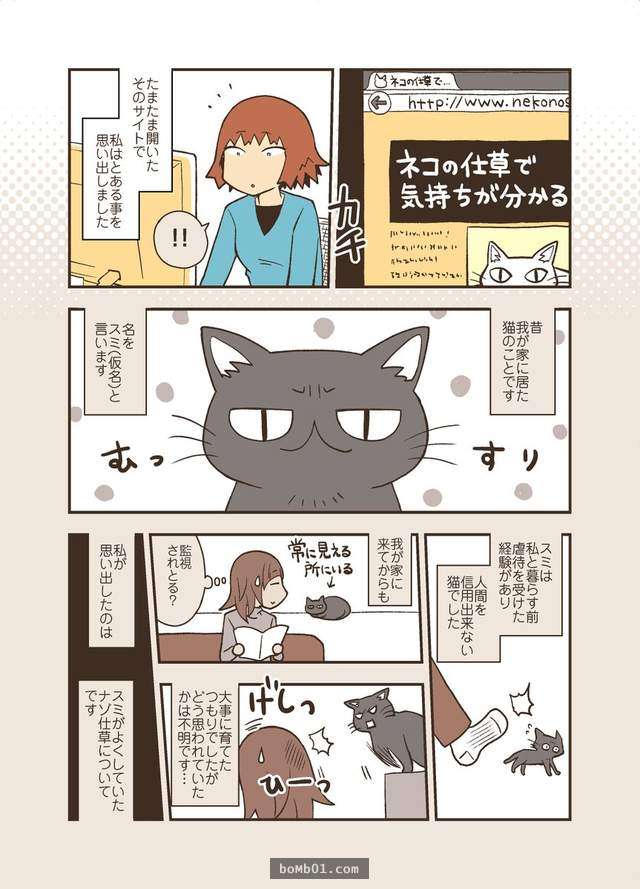 ▼日本漫畫家遠山曜以前養過一隻叫做スミ的貓咪。スミ曾經被虐待過,一直不太親人,被遠山曜一家收養後,也不像其他貓咪一樣撒嬌,總是跟家人保持距離,躲在他們一抬頭就能看到的地方。