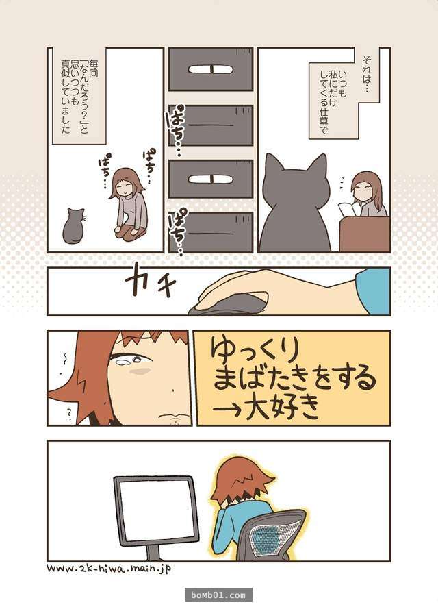 ▼那天遠山曜從網路上看到了「看貓咪的行為理解貓咪的心情」網站,其中寫到,貓咪經常會盯著主人看,然後緩緩地眨眼。スミ以前就是這樣,遠山曜一直不明白牠的意思,只會跟牠眨眼眨回去。現在她才明白,原來這是貓咪表示喜歡的動作!