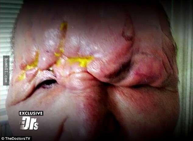 ▼3個月後,可怕的事情發生了,她的臉腫成了「水滴魚」狀,眼睛也無法睜開,看起來就像個怪物。