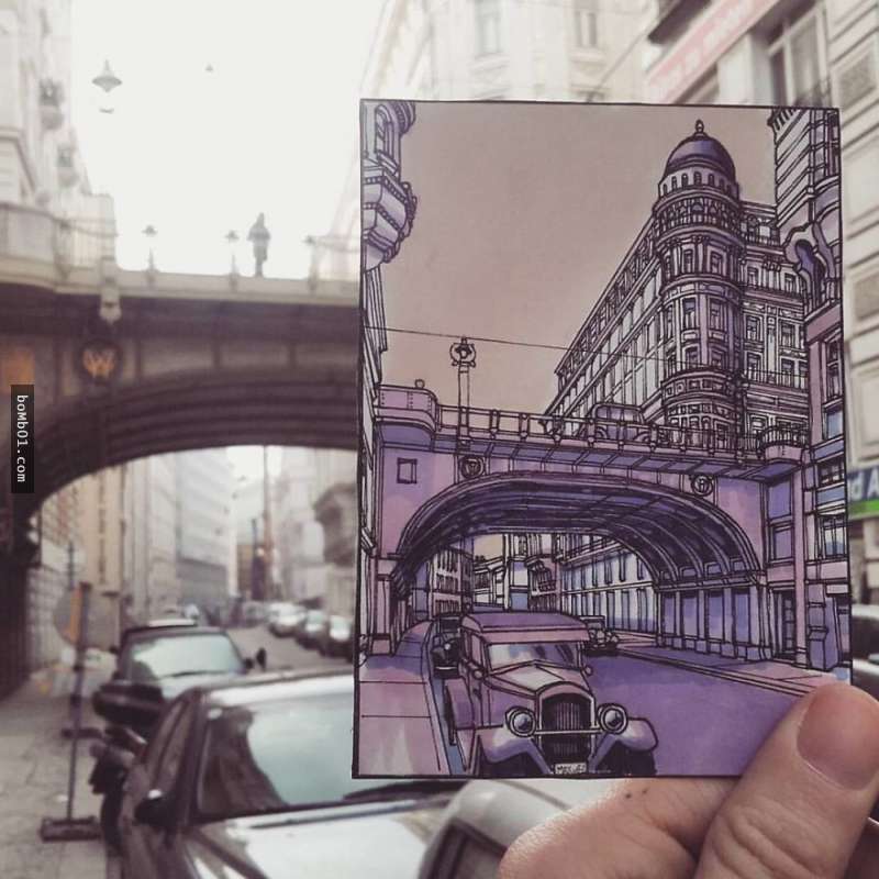 這位畫家筆下的街景很有特色,韻味十足,就像明信片一樣。真希望能夠像他一樣,有一場說走就走的旅行!
