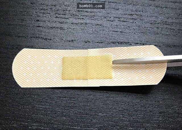 ▼首先,先找來一把經過消毒的乾淨剪刀,在OK繃中央紗布的左右兩側剪下兩道開口。