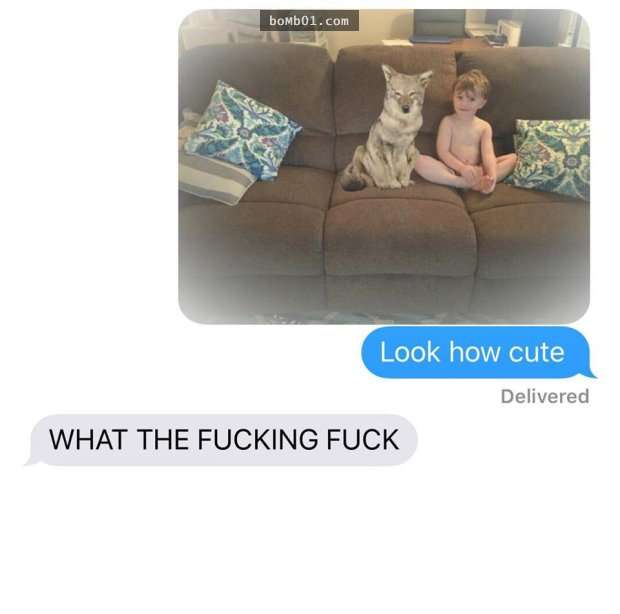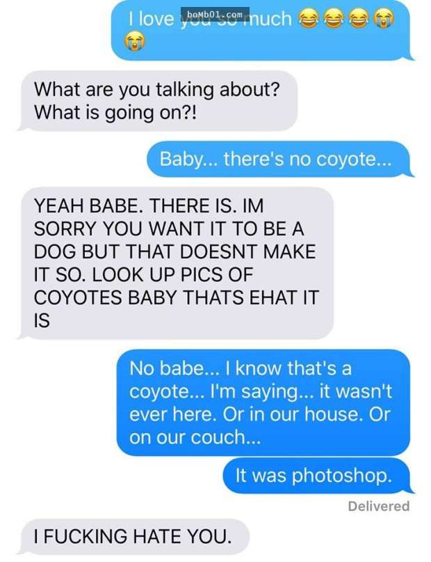▼凱拉最後忍不住爆笑回:「我好愛你哈哈哈!」回家的丈夫則困惑說:「妳他X的在說什麼鬼?這是什麼狀況?」凱拉才坦白說:「寶貝,家裡沒有野狼啦…」但丈夫仍然不解說:「是啊寶貝,我很遺憾妳想要一隻狗,但牠並不是狗,但看看那張該死的照片,牠的確是狼。」凱拉公布解答說:「不寶貝,我知道牠是一隻野狼,我是說,牠根本不在那,不在我們的房內,或我們的沙發上…那是修圖啦。」最後無言的丈夫只好丟下一句:「我他X的恨死妳了。」