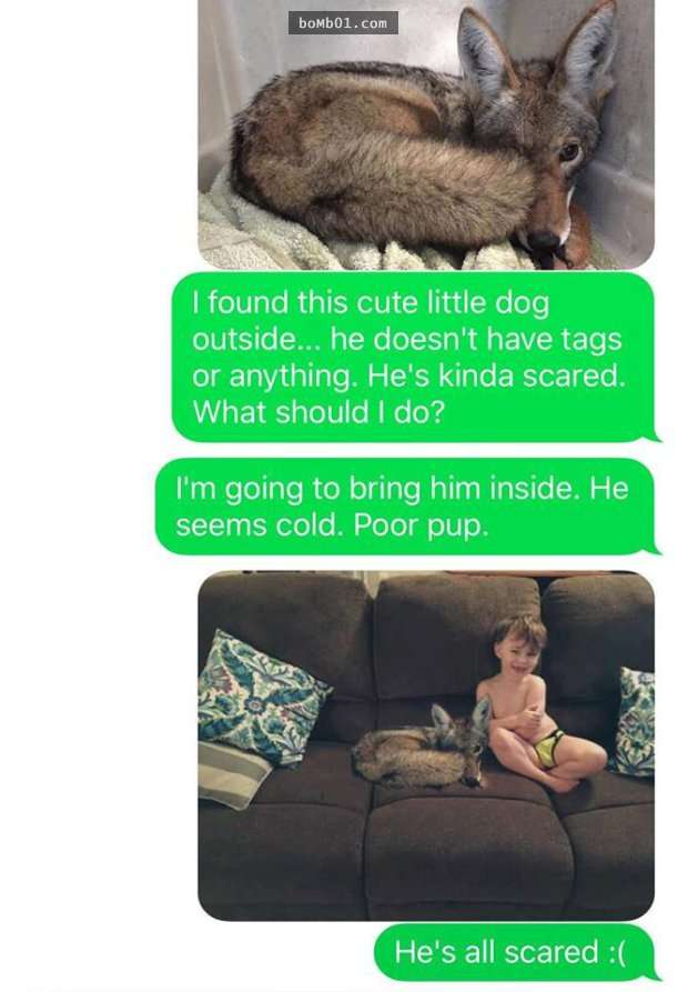▼凱拉向丈夫傳了土狼的照片,並詢問說:「我在外面找到這隻可愛的小狗狗,他身上沒有任何標記,牠看起來有點怕怕的,我應該怎麼做?」、「我要帶牠進家門了,牠看起來覺得很冷,可憐的小東西。」然後她傳了野狼坐在自己兒子旁的照片,「牠嚇壞了。」