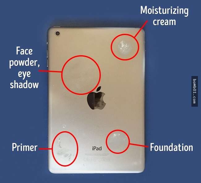 ▼15. 你可以在女生手機背面同時找到:滋潤霜,粉底液,眼影,隔離霜的痕跡。(笑)