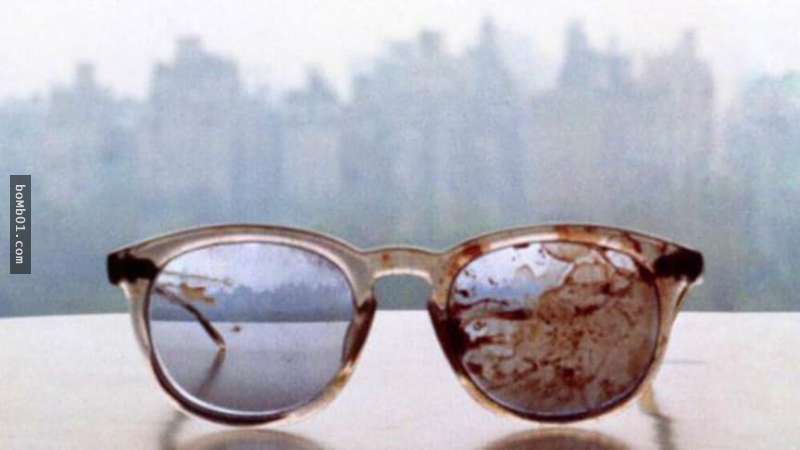 ▼1.約翰藍儂的眼鏡:約翰藍儂被槍殺時正戴著這幅眼鏡。這張照片是小野洋子公開的,她沒有洗掉上面的血跡,保留了那恐怖一天留下的痕跡。